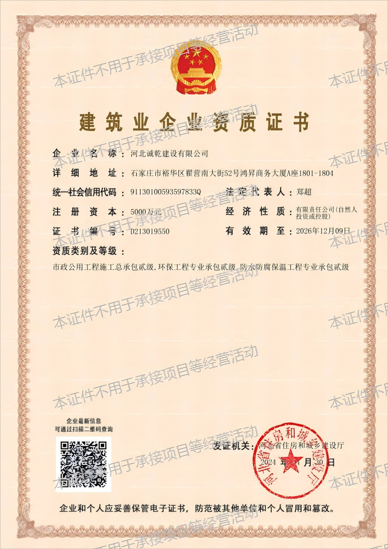 恭賀河北誠乾環(huán)保工程有限公司取得市政公用工程施工總承...